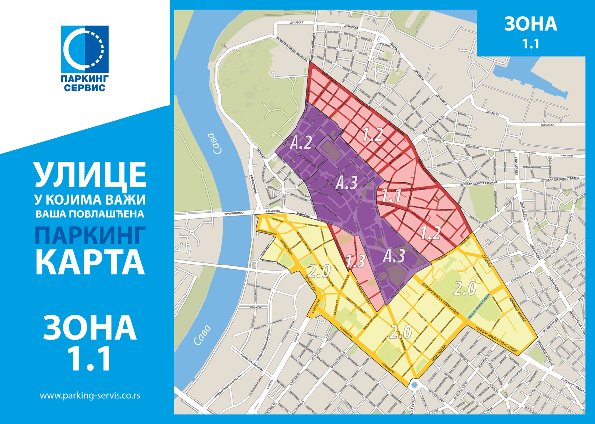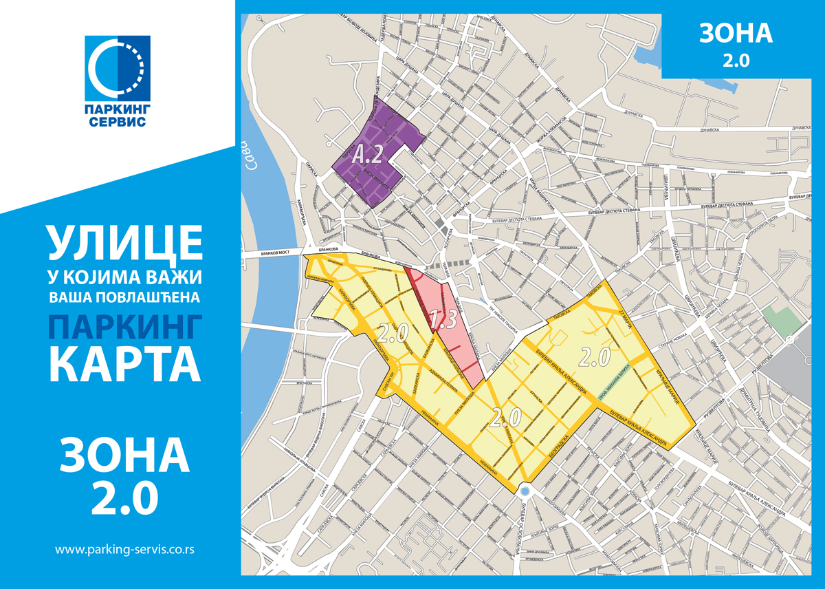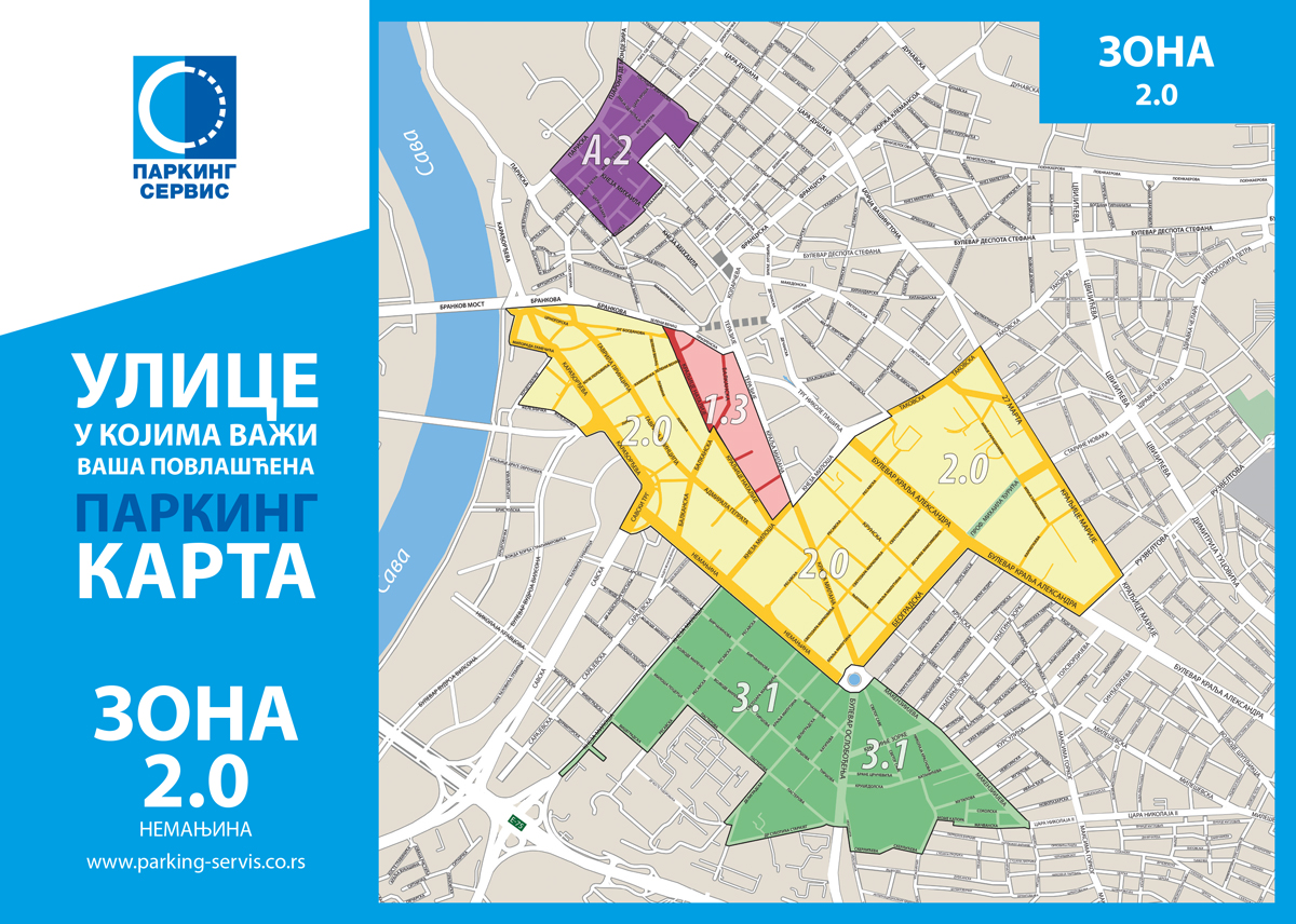 Owners of privileged parking tickets for 2.0.31 zone (Nemanjina Street tenants) can park their vehicles without a time limit only on marked parking places in 2.0, 1.3, A.2, 3.1 zone and Profesora Mihaila Djurića Street.