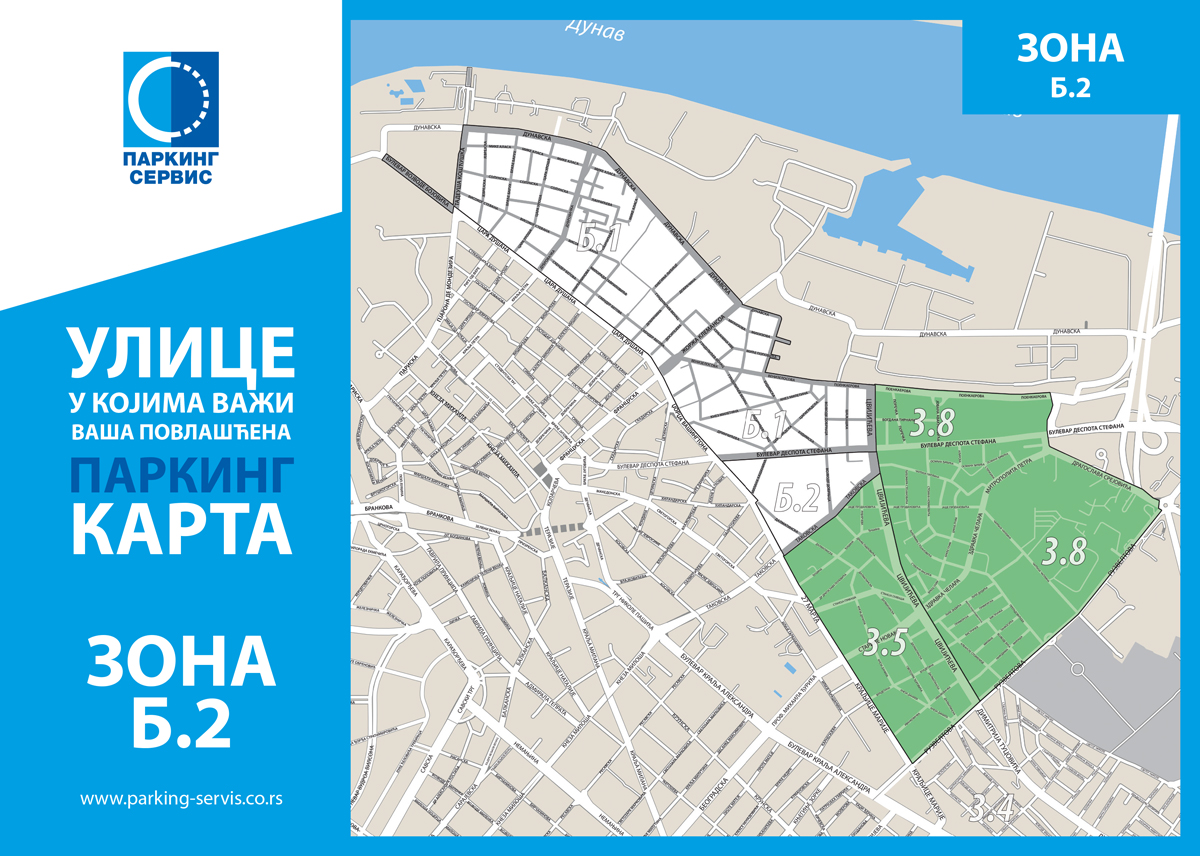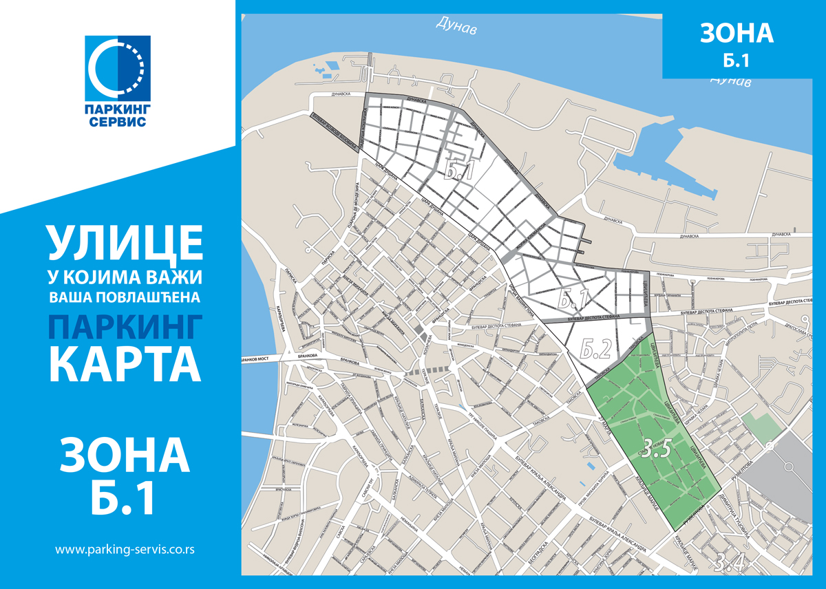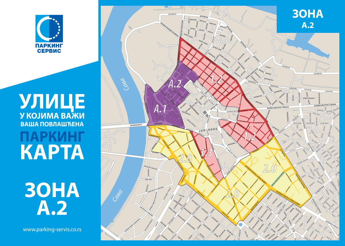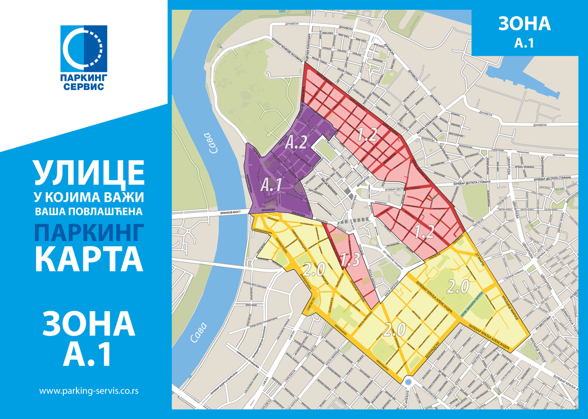 Owners of privileged parking tickets for 2.0.31 zone (Nemanjina Street tenants) can park their vehicles without a time limit only on marked parking places in 2.0, 1.3, A.2, 3.1 zone and Profesora Mihaila Djurića Street.