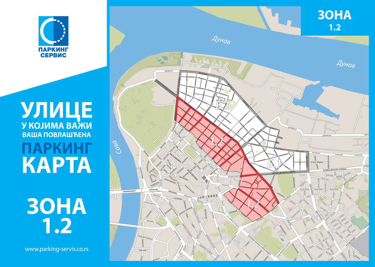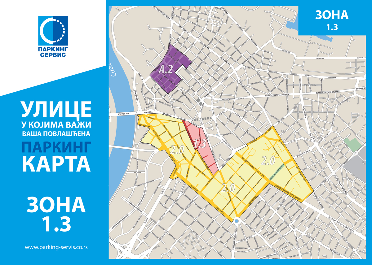 Owners of privileged parking tickets for 1.3 zone can park their vehicles in this zone and A.2, 2.0 and Profesora Mihaila Djurića Street as well, without a charge and a time limit.